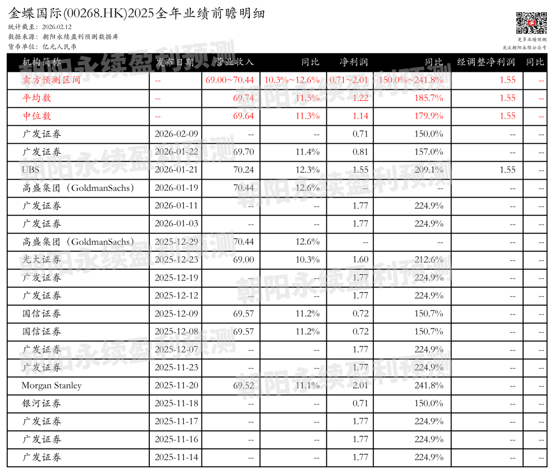 1. 金蝶国际全年业绩预期怎么样? 截至2026年02月12日,根据朝阳永续季度业绩前瞻数据: 预测营业收入69.00~70.44亿元,同比增长10.3%~12.6%;预测净利润0.71~2.01亿元,同比增长150.0%~241.8%;预测经调整净利润1.55亿元。 关注后续财报数据披露后能否超预期,朝阳永续港股季度业绩前瞻数据将为投资者提供业绩鉴定。 | | | 发布日期 六 营业收入 | | 同比 | 净利润 | 同比。 | 经调整净利润 | 同比 | | --- | --- | --- | --- | --- | --- | --- | --- | --- | | 卖方预测区 | | | 69.00~70.44 | 10.3%~12.6% | 0.71~2.01 | 150.0%~241.8% | 1.55 | -- | | 平均数 | | -- | 69.74 | 11.5% | 75 1.22 | 185.7% | 1.55 | -- | | 中位数 | | -- | 69.64 | 11.3% | 1.14 | 179.9% | 1.55 | - | | 广发证券 | | 2026-02-09 ...