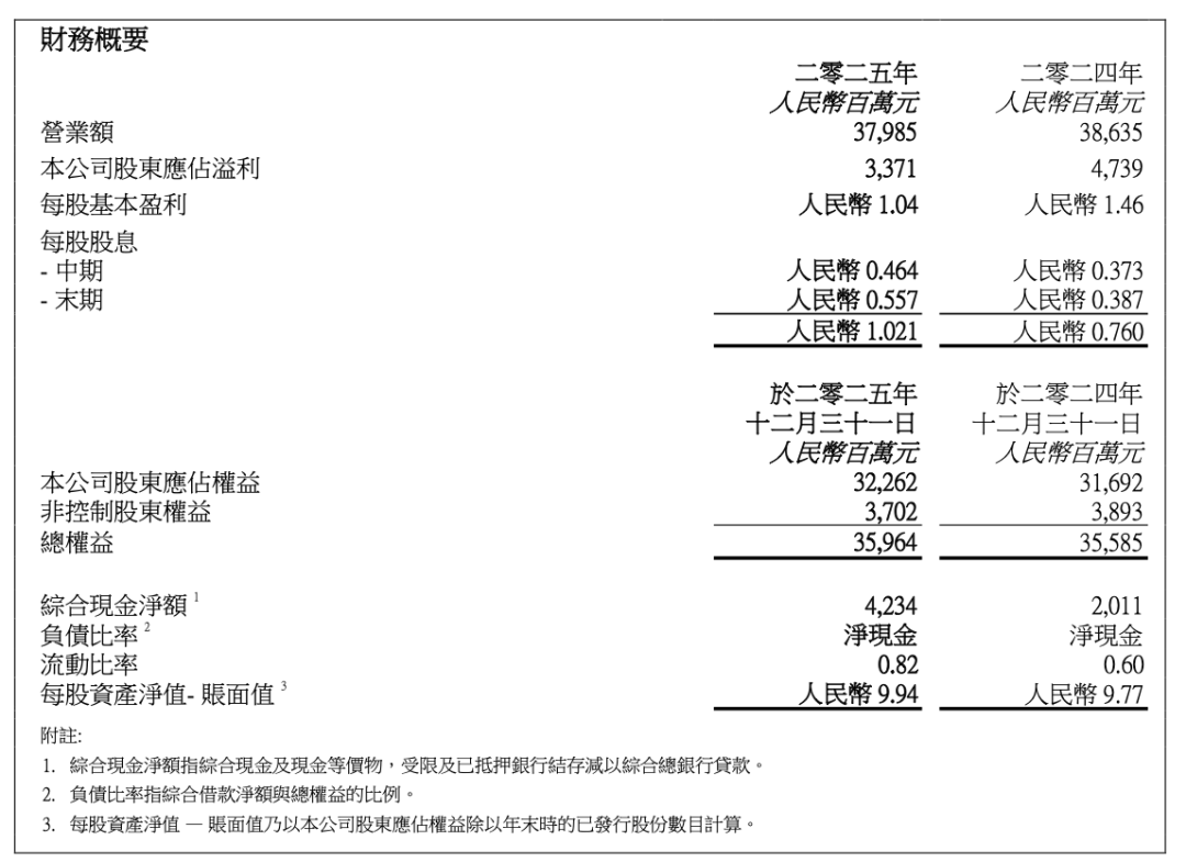 作者丨新经销 3月23日,华润啤酒(00291.HK)在香港召开2025年全年业绩发布会。 表面看,受白酒业务商誉减值28.77亿元拖累,华润啤酒2025年股东应占溢利为33.71亿元。但扣除商誉减值、搬迁收益及产能优化等特别事项后,股东应 占溢利达57.24亿元,同比增长19.6%。 啤酒业务EBITDA同比增长17.4%至96.11亿元。综合营业额379.85亿元,"十四五"期间累计增加65.37亿元。 | 財務概要 | | | | --- | --- | --- | | | 二零二五年 | 二零二四年 | | | 人民幣自萬元 | 人民幣自萬元 | | 營業額 | 37,985 | 38.635 | | 本公司股東應佔溢利 | 3.371 | 4.739 | | 昼股基本盈利 | 人民幣 1.04 | 人民幣 1.46 | | 包股股意 | | | | - 中期 | 人民幣 0.464 | 人民幣 0.373 | | - 末期 | 人民幣 0.557 | 人民幣 0.387 | | | 人民幣 1.021 | 人民幣 0.760 | | | 於二零二五年 | 於二零二四年 | | | 十二月三十一日 | ...