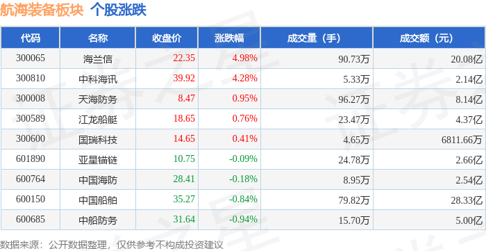 从资金流向上来看,当日航海装备板块主力资金净流入3.79亿元,游资资金净流出7791.6万元,散户资金 净流出3.01亿元。航海装备板块个股资金流向见下表: | 代码 | 名称 | 收盘价 | 涨跌幅 | 成交量(手) | 成交额(元) | | --- | --- | --- | --- | --- | --- | | 300065 | 海兰信 | 22.35 | 4.98% | 90.73万 | 20.08亿 | | 300810 | 中模型 | 39.92 | 4.28% | 5.33万 | 2.14亿 | | 300008 | 天海防务 | 8.47 | 0.95% | 96.27万 | 8.14亿 | | 300589 | 江龙船艇 | 18.65 | 0.76% | 23.47万 1 | 4.37亿 | | 300600 | 園瑞科技 | 14.65 | 0.41% | 4.65万 | 6811.66万 | | 601890 | 亚是锚链 | 10.75 | -0.09% | 24.78万 | 2.66亿 | | 600764 | 中国海防 | 28.41 | -0.18% | 8.95万 | 2. ...