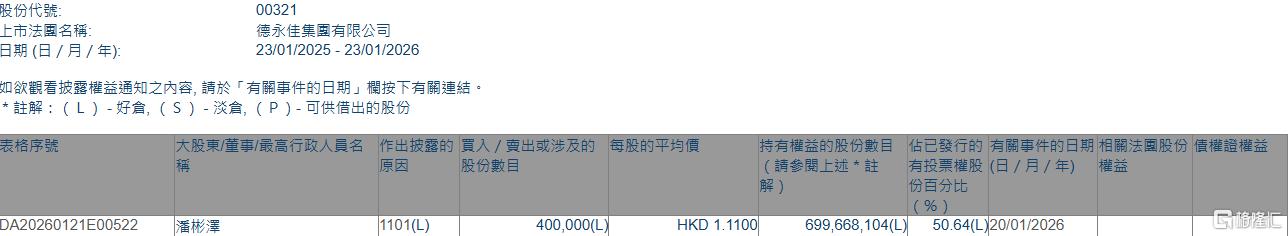 格隆汇1月23日丨根据联交所最新权益披露资料显示,2026年1月20日,德永佳集团(00321.HK)获执行董事潘彬泽在场内以每股均价1.11港元增持40万股,涉 资约44.4万港元。 | 表格序號 | 大股東/董事/最高行政人員名 作出披露的 買入 / 賣出或涉及的 每股的平均價 | | | | 持有權益的股份數目 佔已發行的 有關事件的日期 | | --- | --- | --- | --- | --- | --- | | | 股份數目 | 原因 | | | (語參閱上述 * 註 有投票權股 (日 / 月 / 年) | | | | | | | 份百分比 | | | | | | | ( % ) | | DA20260121E00522 | 删送澳 | 1101(L) | 400,000(L | HKD 1.1100 | 699,668,104(L) 50.64(L)20/01/2026 | 增持后,潘彬泽最新持股数目为699,668,104股,持股比例由50.61%上升至50.64%。 | 股份代號: | 00321 | | --- | --- | | 上市法國名稱: | 德永佳集團有限公司 | | 日期 ...