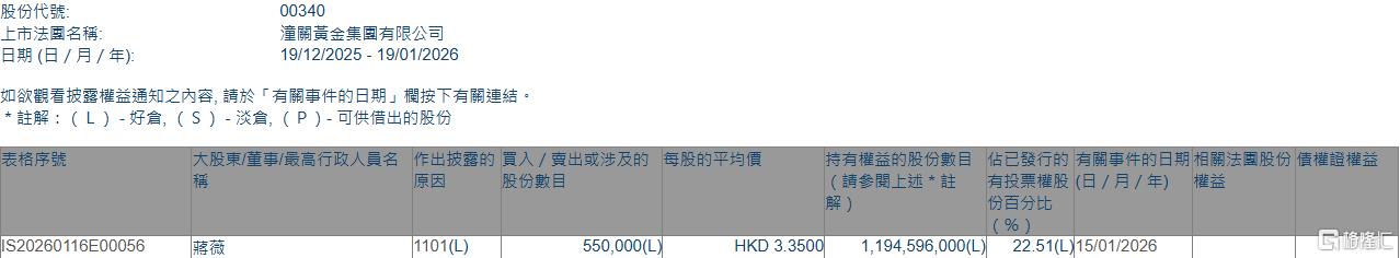 格隆汇1月19日丨根据联交所最新权益披露资料显示,2025年1月15日,潼关黄金(00340.HK)获股东蒋薇在场内以每股均价3.35港元增持55万股,涉资约 184.25万港元。 增持后,蒋薇最新持股数目为1,194,596,000股,持股比例由22.50%上升至22.51%。 | 股份代號: | 00340 | | --- | --- | | 上市法國名稱: | 潼關黃金集國有限公司 | | 日期 (日 / 月 / 年): | 19/12/2025 - 19/01/2026 | | 112 - 11 - | 1011 | | | | | --- | --- | --- | --- | --- | | S20260116E00056 | 1101(L) | 550,000(L) | HKD 3.3500 1,194,596,000(L) 22.51(L)15/01/2026 | 蔣薇 | ...