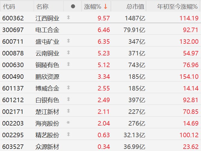 | 代码 | 名称 | | 涨幅% ↓ | 总市值 | 年初至今涨幅% | | --- | --- | --- | --- | --- | --- | | 600362 | 江西铜业 | - | 9.57 | 1487亿 | 114.19 | | 300697 | 电工合会 | | 6.46 | 79.91亿 | 92.71 | | 600711 | 盟中排 | 1 | 6.35 | 347亿 | 132.00 | | 000878 | 云南铜业 | 1 | 5.23 | 371亿 | 54.97 | | 000630 | 铜陵有色 | 1 | 5.12 | 743亿 | 76.96 | | 600490 | 鹏欣资源 | | 3.34 | 185亿 | 154.10 | | 601137 | 博威合金 | 1 - | 2.55 | 185亿 | 14.14 | | 601212 | 白银有色 | 1 | 2.49 | 397亿 | 92.81 | | 002171 | 楚江新材 | 1 | 2.11 | 227亿 | 70.85 | | 002203 | 海亮股份 | 资 | 2.04 | 276亿 | 1 ...