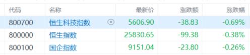 11月19日,港股三大指数再度收跌,恒生科技指数跌0.69%创9月初以来新低,恒生指数、国企指数分别下跌0.38%及0.26%。 | 代码 | 名称 | | 最新价 | 脂跌额 | 涨跌幅 | | --- | --- | --- | --- | --- | --- | | 800700 | 恒生科技指数 | 0 | 5606.90 | -38.83 | -0.69% | | 800000 | 恒生指数 | | 25830.65 | -99.38 | -0.38% | | 800100 | 国企指数 | | 9151.04 | -23.80 | -0.26% | 盘面上,权重科技股多数下跌,小米跌近5%,快手跌超1%,京东、美团百度、腾讯控股微跌,阿里巴巴涨超1%;新能源车企股走低,理想汽车、蔚来下 跌;芯片股下挫,上海复旦等多股下跌;新消费概念股、濠赌股、苹果概念股、机器人概念股、内房股、中医药股多数低迷。 另一方面,高盛指全球央行仍在"爆买",黄金明年有望冲击4900美元,黄金股领涨,中国黄金国际涨超8%;军工股涨幅居前,中船防务涨超9%;石油股拉 升,中国石油化工股份涨近3%;锂电池股走高,天齐锂业涨近3 ...