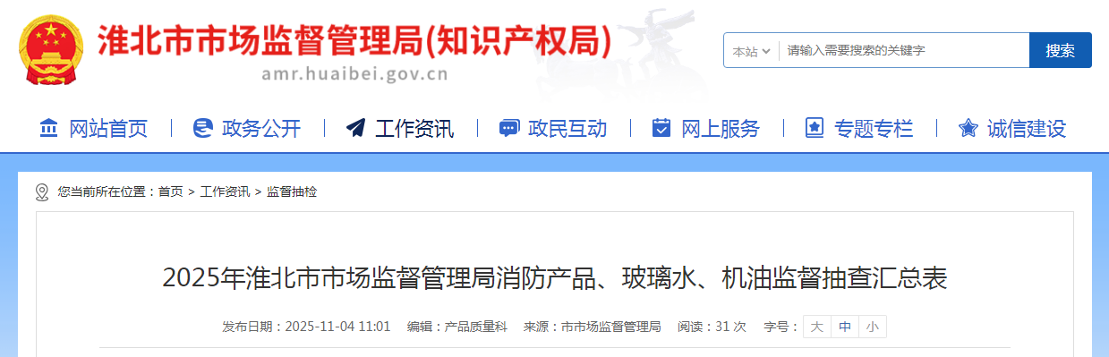 安徽省淮北市市场监督管理局发布2025年消防产品、玻璃水、机油监督抽查汇总表