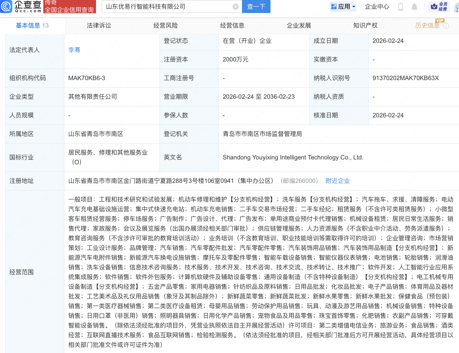 股东信息2 ① ● | 基本信息 13 | 法律诉讼 | | 经营风险 | | | --- | --- | --- | --- | --- | | | | | | (x) 合一人 经营信息 | | © 企查查 您 | | Qcc.com 全国企业信用查询 | 山东优易行智能科技有限公司 | | 企查查APP显示,近日,山东优易行智能科技有限公司成立,注册资本2000万元,经营范围包含:人工智能行业应用系统集成服务;软件销售;软件外包服 务;计算机软硬件及辅助设备零售等。企查查股权穿透显示,该公司由中国石化(600028)旗下中国石化销售股份有限公司等共同持股。 | 传司 Fat | 全国企业信用查询 | 山东优易行智能科技有限公司 | × 查一下 | | --- | --- | --- | --- | | 基本信息 13 | 法律诉讼 | 经营风险 | 经营信息 | | 法定代表人 | 李雪 | 登记状态 | 在营 (开业) 企业 | | | | 注册资本 | 2000万元 | | 组织机构代码 | MAK70KB6-3 | 工商注册号 | l | | 企业类型 | 其他有限责任公司 | 营业期限 | 202 ...
