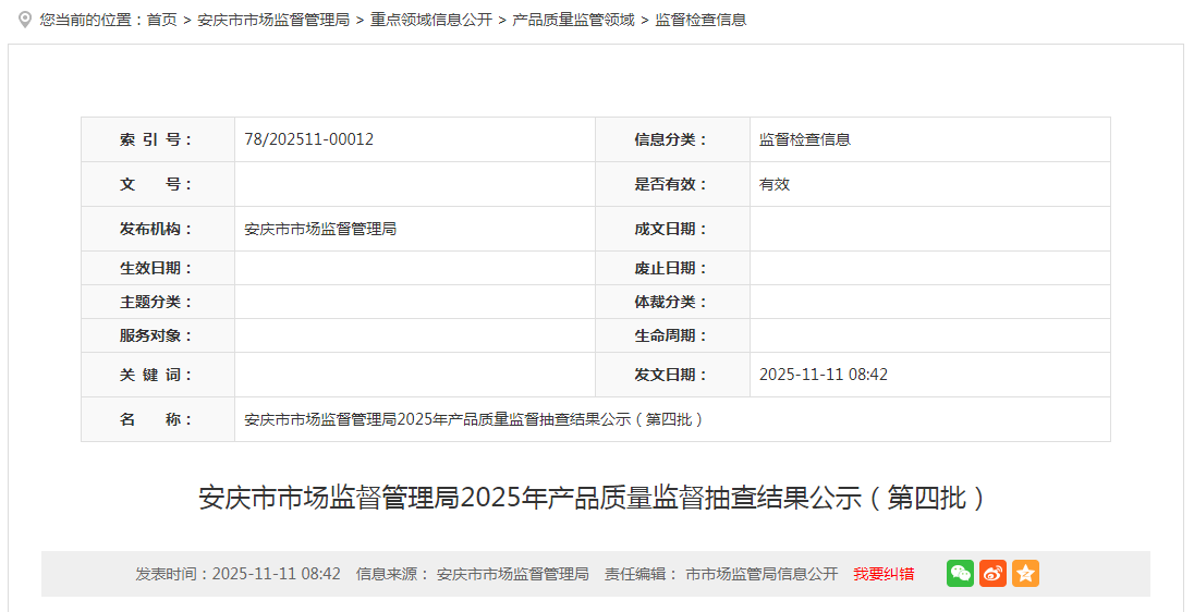 安徽省安庆市市场监督管理局公示2025年产品质量监督抽查结果(第四批)