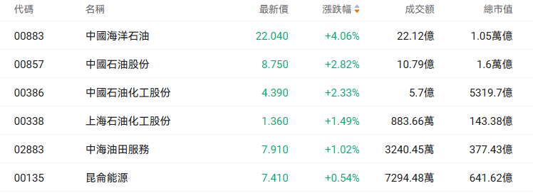 11月10日消息,石油股午后涨幅扩大,截至发稿,涨超4%,涨近3%, 涨超2%。 消息面上,11月2日,OPEC+主产八国宣布12月将进一步增产13.7万桶/日,同时由于季节性因素暂停2026 年1至3月的增产。此外,美国对俄两大石油生产商实施制裁后。民生证券指出,由于OPEC+于26年一季度 暂停增产超市场预期,叠加美国对俄罗斯的制裁影响,当前市场悲观情绪好转,但对需求较弱、供应过剩 的情绪仍在,预计油价短期依然以震荡为主线。 光大证券指出,面对新一轮油价波动周期,"三桶油"深化增储上产,加强成本管控,以自身发展的确定性 应对外部环境的不确定性,在油价下行期的业绩韧性凸显。"三桶油"将继续加强增储上产,中国石油、中 国石化、中国海油25年油气当量产量计划分别增长1.6%、1.5%、5.9%;加快中下游炼化业务转型,炼油板 块推进低成本"油转化"、高价值"油转特",销售板块积极向"油气氢电服"综合能源服务商转型,化工业务 稳步提升高附加值产品比例。"三桶油"有望实现穿越油价周期的长期成长,长期投资价值凸显。 | 代碼 | 名稱 | 最新價 | 漲跌幅 ◆ | 成交額 | 總市值 | | --- | --- | ...
