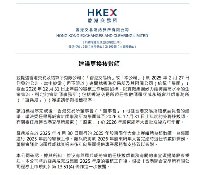 (来源:MBMC美顺) 来源:市场资讯 港交所(00388.HK)公告,委任毕马威会计师事务所为集团2026年度(截至2026年12月31日)的外聘核数师 (审计师),有关委任须待香港交易所股东于2026年股东周年大会批准后方可作实。 普华永道在于2025年4月30日举行的2025年股东周年大会上获续聘为审计师,为集团进行2025年度的审 核工作。 普华永道将于2026年股东周年大会完结时退任审计师职务。 香港交易所(00388.HK)于2000年6月27日在联交所上市,当时IPO的审计师便是普华永道。 | | 參與介紹各方 | | --- | --- | | 介紹的保薦人 | 滙豐投資銀行亞洲有限公司 | | | 香港 | | | 皇后大道中1號 | | | 15樓 | | | Merrill Lynch Far East Limited | | | 香港 | | | 中環 | | | 花園道3號 | | | 亞太金融中心17樓 | | | 摩根士丹利添惠亞洲有限公司 | | | 香港 | | | 中環 | | | 交易廣場第三座 | | | 30樓 | | 本公司的法律顧問 | 安理國際律師事務所 | | ...