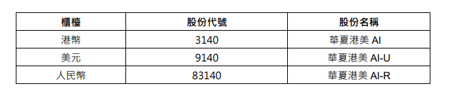 | 櫃檯 | 股份代號 | 股份名稱 | | --- | --- | --- | | 港幣 | 3140 | 華夏港美 Al | | 美元 | 9140 | 華夏港美 AI-U | | 人民幣 | 83140 | 華夏港美 AI-R | 详情如下: 据了解,华夏港美人工智能ETF紧密追踪"Solactive港美人工智能50精选指数",该指数严格筛选最多50 家于中国香港及美国上市的AI领域领先企业,剔除伪概念股,聚焦纯正AI标的,兼顾收益底盘与超预 期弹性。 3月16日,香港交易所发文称,华夏港美人工智能ETF的港币,美元,人民币柜台单位(统称"单位")预计 在2026年3月18日开始在香港联合交易所有限公司上市及买卖,及于当日被纳入成为中央结算系统多柜 台合资格证券(按香港结算一般规则所定义)。港元交易柜台的股份代号(03140)将会成为多柜台合资格证 券于中央结算系统内记录活动及持股量的主要股份代号。 ...