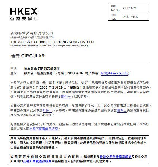恒生黃金 ETF 的交易安排 車頁: 參與者一般查詢熱線 1(電話 :2840 3626 電子郵箱 : trd@hkex.com.hk) 查詢 : 1月28日,香港交易所发布恒生黄金ETF的交易安排。恒生黄金ETF(03170)已获香港证券及期货事务监 察委员会认可为集体投资计划并预计于2026年1月29日(星期四)开始在交易所买卖及获准列入认可卖空 指定证券。资料显示,恒生黄金ETF每手买卖单位50个。 HKEX 香 港 交 易 所 线 CT/014/26 Ref. No .: 日期 28/01/2026 Date 香港聯合交易所有限公司 (面湛交易及結蘭所有限公司全資附屬公司) THE STOCK EXCHANGE OF HONG KONG LIMITED (A wholly-owned subsidiary of Hong Kong Exchanges and Clearing Limited) 通告 CIRCULAR 如 需 要 更 多 有 關 交 易 所 買 賣 基 金 的 資 料 · 請參閱載於香港交易所披露易網站及香港交易 所網站的交易所買賣產品版頁由基金經理人發出的招股章程及其他文件 · 交易 ...