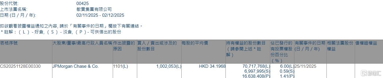 格隆汇12月2日丨根据联交所最新权益披露资料显示,2025年11月25日,敏实集团(00425.HK)获JPMorgan Chase & Co.以每股均价34.1968港元增持好仓100.21 万股,涉资约3426.7万港元。 | FREE FREE | 大股東/董事/最高行政人員名稱作出披露的 買入 / 曹出或涉及的 | | | 每股的平均價 | 四角分会见你赞母姓 | 佔已發行的 有關事件的日期 | | --- | --- | --- | --- | --- | --- | --- | | | | 版 演歌日 | | | 【 暗号码 370 1 | | | | | | | | | 分目分明 | | CS20251128E00330 | JPMorgan Chase & Co. 1101(L) | | 1,002,053(L) | HKD 34. 1968 | 70.717.768(L | 6.00(L)25/11/2025 | | | | | | | 6.997.995(S) | 0.59(S) | | | | | | | 16,638,408(P) | 1.41(P) | 增持后,JPMorgan Ch ...