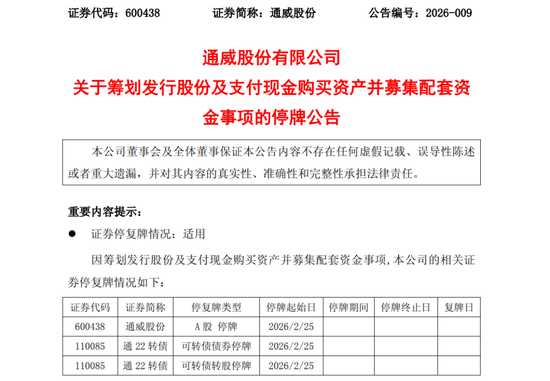 【导读】通威股份筹划购买丽豪清能100%股权,加码半导体业务,股票停牌 2月24日,通威股份发布公告称,公司正在筹划通过发行股份及支付现金的方式,购买青海丽豪清能股份有限公司(以下简称丽豪清能)100%股权,并募 集配套资金。 | 证券代码 | 证券简称 | 停复牌类型 | 停牌起始日 | 停牌期间 | 停牌终止日 | 复牌日 | | --- | --- | --- | --- | --- | --- | --- | | 600438 | 通威股份 | A 股 停牌 | 2026/2/25 | | | | | 110085 | 通 22 转债 | 可转债债券停牌 | 2026/2/25 | | | | | 110085 | 通 22 转债 | 可转债转股停牌 | 2026/2/25 | | | | 通威股份表示,本次交易不会导致公司控股股东、实际控制人变更,不构成关联交易,预计不构成重大资产重组。 为保证公平信息披露,维护投资者利益,避免对公司股价造成重大影响,公司股票、可转债债券以及可转债转股自2026年2月25日起开始停牌,预计停牌 时间不超过10个交易日。 丽豪清能官网显示,公司成立于2021年4月,主 ...