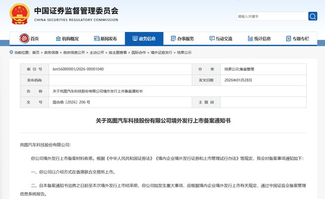 【文/观察者网 潘昱辰 编辑/高莘】1月28日,中国证券监督管理委员会发布《关于岚图汽车科技股份有 限公司境外发行上市备案通知书》。《通知书》显示,岚图汽车以介绍方式在香港联合交易所上市。 岚图汽车 岚图汽车 1月13日,东风汽车集团有限公司、东风汽车集团(武汉)投资有限公司和东风集团股份发布联合公 告,称东风汽车集团(武汉)投资有限公司通过吸收合并方式将东风集团股份私有化、东风集团股份分 派岚图股份及撤销东风集团股份上市地位的建议,已获得国家发改委、商务部及国家外汇管理局的批 准、备案或登记以及与合并相关的其他适用政府批准,不过彼时尚未获得证监会国际合作司对介绍上市 的备案、联交所对介绍上市的原则性批准及介绍上市所需的其他主管部门的批准。 根据东风集团股份披露的数据,2025年,东风集团股份累计销售汽车189.62万辆,同比增长0.01%;其 中新能源汽车销售56.28万辆,同比增长42.62%。作为东风集团旗下的高端新能源品牌,岚图汽车去年 全年销售15.02万辆,同比增长87.44%。 本文系观察者网独家稿件,未经授权,不得转载。 《通知书》显示,自出具之日起至本次境外发行上市结束前,岚图汽车如发生重大 ...