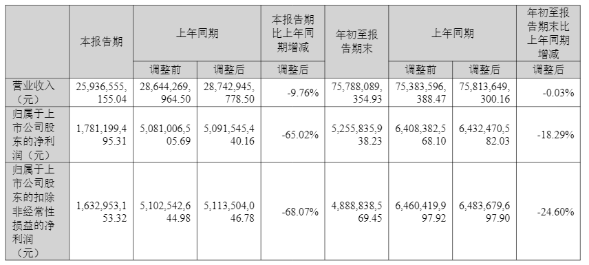 Core Points - The company reported a slight decrease in revenue for the first three quarters of the year, totaling 757.88 billion yuan, a year-on-year decrease of 0.03% [1] - The net profit attributable to shareholders for the same period was 52.56 billion yuan, reflecting a significant year-on-year decrease of 18.29% [1] - In the third quarter alone, the company experienced a revenue drop of 9.76%, amounting to 259.37 billion yuan, and a drastic decline in net profit of 65.02%, totaling 17.81 billion yuan [1] Financial Summary - Revenue for the third quarter was 259.37 billion yuan, down from 288.64 billion yuan in the same period last year, marking a decrease of 9.76% [2] - The net profit attributable to shareholders in the third quarter was 17.81 billion yuan, compared to 51.81 billion yuan in the previous year, a decline of 65.02% [2] - For the first three quarters, the net profit attributable to shareholders was 52.56 billion yuan, down from 64.08 billion yuan year-on-year, a decrease of 18.29% [2] Profit Distribution Plan - The company announced a profit distribution plan, proposing a cash dividend of 3 yuan per 10 shares, which totals approximately 19.94 billion yuan (including tax) based on the total share capital as of September 30, 2025 [2] - The cumulative distributable profit within the consolidated financial statements is reported at 240.24 billion yuan, while the parent company's distributable profit is 295.01 billion yuan [2]