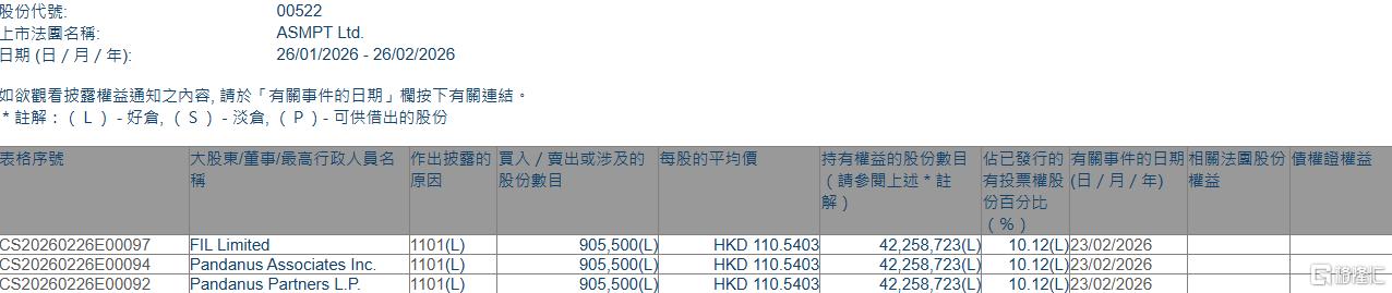 增持后,FIL Limited最新持股数目为4225.872万股,持股比例由9.90%上升至10.12%。 | 股份代號: | 00522 | | --- | --- | | 上市法國名稱: | ASMPT Ltd. | | 日期(日 / 月 / 年): | 26/01/2026 - 26/02/2026 | 格隆汇2月26日丨根据联交所最新权益披露资料显示,2026年2月23日,ASMPT(00522.HK)获FIL Limited在场内以每股均价110.5403港元增持90.55万股,涉 资约1亿港元。 | 表格序號 | | 大股東/董事/最高行政人員名 作出披露的 買入 / 賣出或涉及的 每股的平均價 | | | | 持有權益的股份數目 佔已發行的 有關事件的日期 | | --- | --- | --- | --- | --- | --- | --- | | | | 潟达 | 股份數目 | | 請參閱上述*註 | 有投票權股 (日 / 月 / 年) | | | | | | | | 份自分比 | | | | | | | | 961 | | CS20260226E00097 | FIL Limited | ...