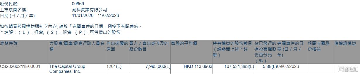| 表格序號 | 大股東/董事/最高行政人員名 作出披露的 買入 / 賣出或涉及的 每股的平均價 | | | 持有權益的股份數目 佔已發行的有關事件的日 相關法 | | --- | --- | --- | --- | --- | | | 股份數目 | | | (請參閱上述*註 有投票權股 期(日 / 月 / 份權益 | | | | | | 份自分比 | | CS20260211E00001 | The Capital Group 7,995,060(L | 1201(L) | HKD 113.6963 | 107,531,383(L) 5.88(L)09/02/2026 | | | Companies, Inc. | | | | | 股份代號: | 00669 | | --- | --- | | 上市法國名稱: | 創科實業有限公司 | | 日期 (日 / 月 / 年): | 11/01/2026 - 11/02/2 | 格隆汇2月11日丨根据联交所最新权益披露资料显示,2026年2月9日,创科实业(00669.HK)遭The Capital Group Companies, Inc.在场内以每股均价113. ...