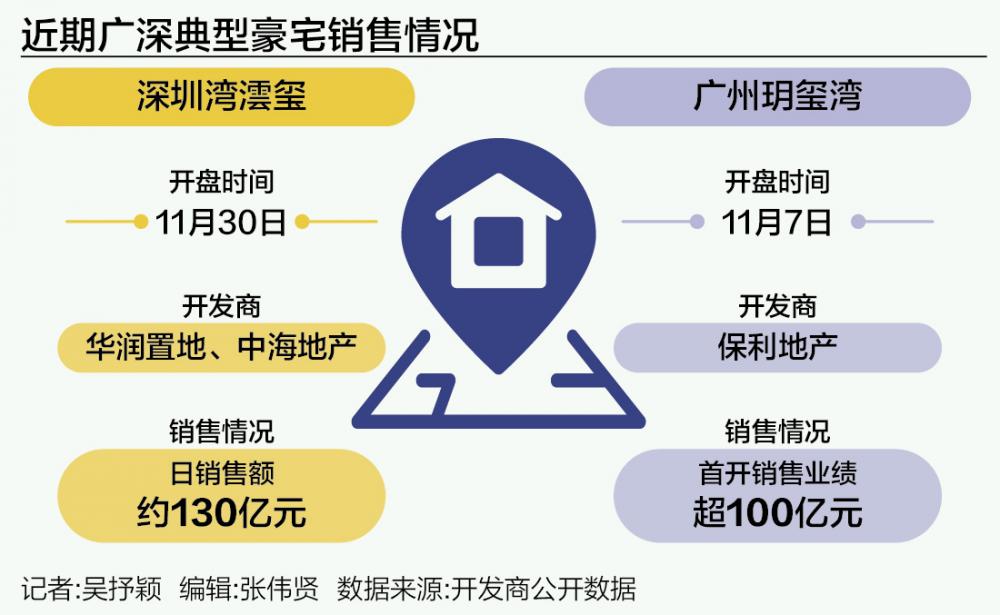 淡市之中,高端住宅走出了独立行情。 近日,由华润置地与中海地产联合打造的深圳湾澐玺正式开盘,首推348套建筑面积约209-1149平方米的大平层,开发商官宣单日销售额约130 亿元,刷新今年国内新房开盘成交纪录。 这是大湾区近期又一热销的高端住宅。11月7日,广州保利玥玺湾首开实现销售业绩超100亿元,成为今年全国首个"百亿开盘"现象级项目。开 盘当天销售额即位列2025年中国房地产项目销售金额前五。 这两个项目的热销,是略超出市场预期的表现。广州、深圳房地产市场在今年下半年整体表现平淡,一手房部分项目"以价换量",二手房价格 体系也被重塑,市场观望情绪浓厚。进入年底,高端项目去化顺畅,也为市场注入了一剂"强心针",这表明在"好房子"的加持下,市场上的购 买力就能够得到释放。 高端住宅走出独立行情,市场当前更关注的是,这种情绪能否持续传递以改善当前楼市的基本面。业界普遍认为,高端住宅带动了高净值人群 的入市,而后广州、深圳还有若干高端住宅即将入市,如若能够打通置换链条,则能够带动一部分潜在购房者入市,进而提振市场情绪。 高端住宅热销 深圳湾澐玺在出让之时就已经备受期待。 2024年12月2日,中海地产、华润置 ...