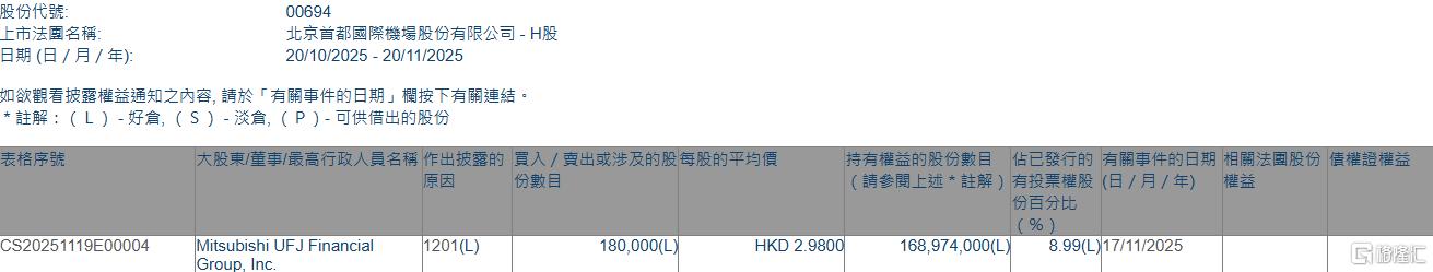 Mitsubishi UFJ Financial Group, Inc.减持北京首都机场股份(00694)18万股 每股作价2.98港元