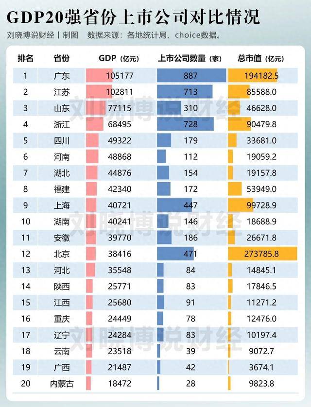 转自:刘晓博说财经 2025年前三季度,中国经济交出了一份稳中向好的答卷,GDP同比增长5.2%。 从区域经济结构来看,粤、苏、鲁、浙、川五大经济强省,以占全国近40%的GDP总量,构成了拉动增 长的核心引擎。 一个地区上市公司的数量、市值、盈利能力和产业分布,是观察其经济活力、结构成色和未来潜力的最 佳窗口。 近期,Choice公布的一份关于五大经济强省A股上市公司的比拼数据,引发了市场高度关注。 通过对这份数据的深度研判,我们可以清晰地看到,为什么广东作为"中国经济第一省"的地位如此稳 固。 01 三大核心指标,广东全面领跑 在资本市场,上市公司的规模体量是衡量区域经济实力的直观指标。 在这场A股上市公司的较量中,广东在三大关键维度上均展现了领跑地位。 1、从A股上市公司数量看,广东稳居全国第一。 截至11月4日,广东A股上市公司达887家。紧随其后的是浙江(728家)和江苏(713家)。 广东比江苏多出174家,比山东多出577家。这一数量优势不仅代表着更活跃的经济生态,也体现了其市 场化机制的成熟与高效。 | 排名 | ફ્રીસ | GDP (亿元) | 同可公司改量(家) | 总市值(亿元) | ...