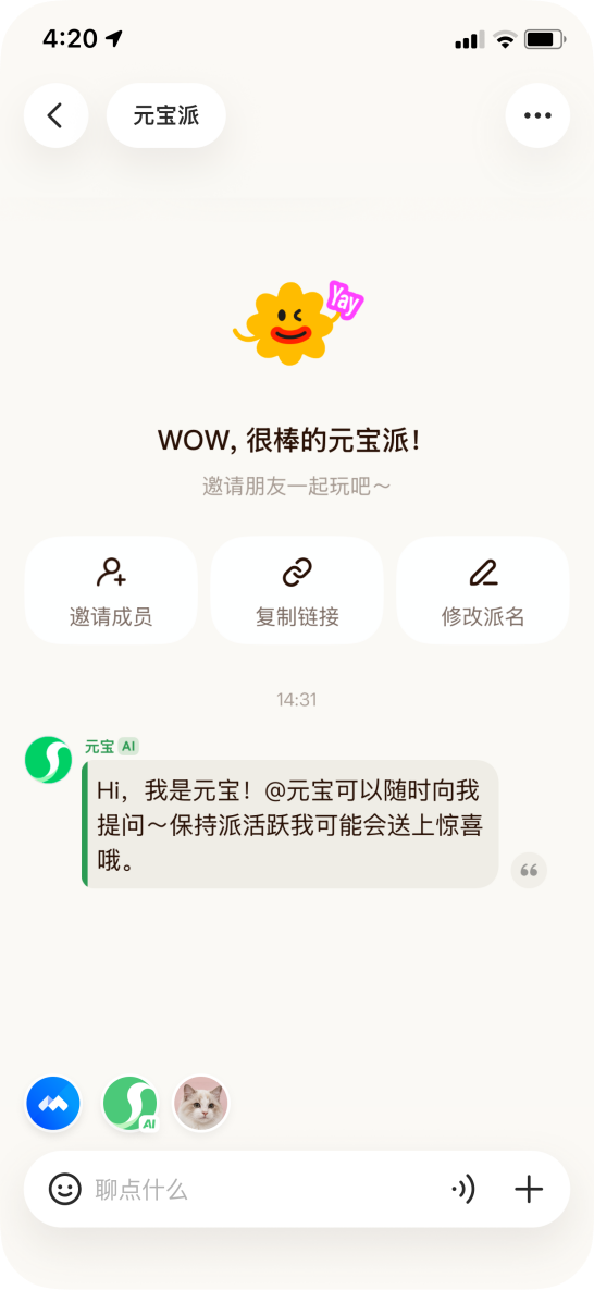 4:20 ◀ 元宝派 WOW, 很棒的元宝派 邀请朋友一起玩吧~ 邀请成员 复制链接 14:31 我是元宝! @元宝可以随 Hi, 提问~保持派活跃我可能会送 哦。 工作 一 / | / , 元宝 AI 公测期间,将元宝APP更新到2.56.0以上版本,通过元宝APP的"我们"入口,在"派邀请码"里输入邀请码,即可获得创建派的能力。没有获得邀请码的用户, 也可以通过朋友分享的派链接和派号加入派。 2月1日,腾讯旗下AI助手元宝正式宣布"元宝派"公测上线,探索AI社交赛道。"元宝派"是腾讯全新的AI社交探索,用户可通过元宝APP创建或加入一 个"派"。在元宝派里,元宝AI作为派友,能够与用户聊天互动、协作与娱乐。除了内测已有的@元宝AI对话、P图二创和共享屏幕等能力。公测版本还打通 了腾讯视频、QQ音乐内容生态,用户可以与派友一起听音乐、一起看电影,畅享QQ音乐海量曲库歌曲、腾讯视频VIP精选影片。 ...