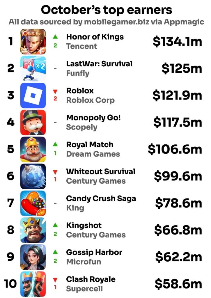近日,外媒Mobilegamer.biz发布了2025年10月的全球手游收入榜。(注:数据来源AppMagic,统计范围不包 括第三方安卓渠道、网页商店及广告收入,且已扣除平台分成) 《Roblox》排名第3,其营收较夏季的历史峰值明显回落——夏季时它的单月内购收入(IAP)曾超过1.5亿美 元。10月该游戏营收1.22亿美元,与9月基本持平,且远高于夏季爆发前每月1亿至1.1亿美元的常规水平。 《Monopoly Go》与《Royal Match》10月营收表现常规,分别为1.18亿美元和1.07亿美元。而点点互动的 《Whiteout Survival》(无尽冬日)增势放缓——在连续两个月营收下滑后,跌至榜单第六,自2024年9月以 来首次跌破1亿美元大关。 《糖果传奇》延续稳定表现,营收始终维持在8000万美元左右;点点互动旗下《Kingshot》(奔奔王国)则 持续攀升,10月营收达到6680万美元,再创历史新高。 柠檬微趣《Gossip Harbor》同样突破6000万美元关口;但《皇室战争》的回暖势头似乎见顶,10月营收约 5860万美元,环比下降近1000万美元,不过仍远高于春季回暖前每月约13 ...