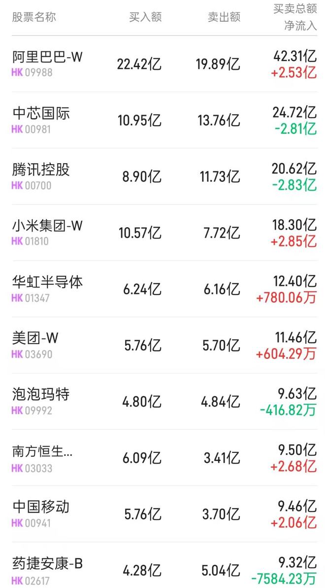 智通财经APP获悉,11月5日港股市场,北水成交净买入103.73亿港元,其中港股通(沪)成交净买入33.59亿港元,港股通 (深)成交净买入70.14亿港元。 北水净买入最多的个股是南方恒生科技(03033)、阿里巴巴-W(09988)、小米集团-W(01810)。北水净卖出最多的个股是华 虹半导体(01347)、中芯国际(00981)、赣锋锂业(01772)。 | 股票名称 | 买入额 | 卖出额 | 买卖总额 | | --- | --- | --- | --- | | | | | 净流入 | | 阿里巴巴-W | 22.42 乙 | 19.89 亿 | 42.31亿 | | HK 09988 | | | +2.53亿 | | 中芯国际 | 10.95 乙 | 13.76 乙 | 24.72亿 | | HK 00981 | | | -2.81 Z | | 腾讯控股 | 8.90亿 | 11.73 乙 | 20.62亿 | | HK 00700 | | | -2.83 G | | 小米集团-W | 10.57 亿 | 7.72亿 | 18.30 乙 | | HK 01810 | | | +2.85 Z | ...
