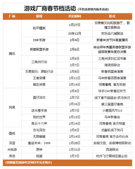 没几天就是大年三十了。 春节,不仅是阖家团圆的日子,也是文化娱乐消费的高峰期。对于游戏行业,春节档,已经变成了一场无声无息又硝烟弥漫的战役。 各大游戏的新春版本这段时间陆陆续续开放,大把福利轮番上阵,版本活动量大管饱,玩家每天的游戏时长直线上升。 游戏外的春节发行动作更是看得人眼花缭乱,有的游戏发力线下,有的游戏线上线下两手抓,有的游戏甚至登上了地方卫视的春晚舞台。 根据公开信息,竞核整理了各大游戏的春节档发行动作(不包含游戏内版本活动),如下图所示。 | | | 游戏厂商春节档活动(不包含游戏内版本活动) | | | --- | --- | --- | --- | | ■ | 游戏 | 开启时间 | 形式 | | | 和平精英 | 1月27日 | 甘肃省文化和旅游厅、敦 煌文旅联动 | | | | 25年12月 | 欢乐谷八城联动 | | | DNF手游 | 2月4日 | 新春年货节抖音直播间 | | 腾讯, | 英雄联盟手游 | 2月6日 | 峡谷拜年秀暨英雄联盟手游 超级联赛年度总决赛 | | | 三角洲行动 | 2月6日 | 三角洲深圳红运市集 | | | | 2月7日 | 海底捞联动 | | | 无 ...