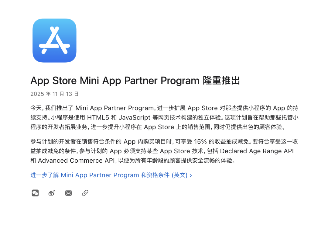 Group 1 - Apple officially announced the "Mini Apps Partner Program," marking the first institutionalized inclusion of mini programs into the iOS ecosystem, providing developers with new commercialization pathways [3][4] - Mini Apps are self-contained experiences built on web technologies like HTML5 and Java, distributed within a "host app" without the need for installation [3] - Developers meeting the requirements can enjoy a significantly reduced revenue share of 15% on digital goods, compared to the traditional 30% in-app purchase fee [3][4] Group 2 - Tencent reported a total revenue of 192.87 billion yuan for Q3 2025, a year-on-year increase of 15%, with strong growth driven by AI investments [23][25] - The company increased its R&D spending by 28% year-on-year to 22.8 billion yuan, marking a new quarterly high [25][26] - Tencent's CEO emphasized the goal of integrating AI functionalities into WeChat, aiming to create an "AI intelligent body" to assist users across various ecosystems [27] Group 3 - JD.com reported Q3 2025 revenue of 299.1 billion yuan, a year-on-year increase of 14.9%, but net profit dropped to 5.3 billion yuan from 11.7 billion yuan [29][30] - The company highlighted significant growth in its supermarket category and a 214% increase in revenue from new businesses like food delivery [29][30] - JD plans to enhance its supply chain infrastructure by purchasing 3 million robots and 1 million unmanned vehicles over the next five years [31] Group 4 - Baidu launched the world's first native multimodal large model, Wenxin 5.0, with a parameter count of 2.4 trillion, supporting various input and output modalities [68] - The model's capabilities in multimodal understanding and creative writing are on par with leading models like Gemini-2.5-Pro and GPT-5-High [68] - Baidu's CEO emphasized the importance of continuous investment in R&D to push the limits of intelligence technology [68]