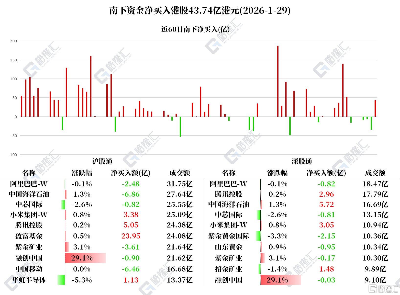 1月29日,南下资金净买入港股43.74亿港元。 其中:净买入盈富基金23.95亿、腾讯控股8亿、小米集团-W 6.43亿、招金矿业1.48亿、华虹半导体1.13亿;净卖出中国移动6.45亿、紫金矿业3.77亿、阿里 巴巴-W 3.3亿、紫金黄金国际2.15亿、中芯国际1.62亿、中国海洋石油1.13亿。 北水动向 小米集团:港交所文件显示,小米集团于1月26日以1.404亿港元回购400万股B类股份。 招金矿业:国际金价继续狂飙猛进。今日,现货黄金价格站上5500美元关口。麦格理此前研报指出,招金矿业持续扩大其黄金矿场组合,通过勘探实现有机 增长。该行将招金矿业2025至2027年净利润预测分别上调10%、74%及50%,至36.17亿、49.91亿及42.93亿元人民币。 据统计,南下资金已连续5日净买入腾讯,共计42.8853亿港元;连续19日净卖出中国移动,共计154.3408亿港元;连续5日净卖出阿里巴巴,共计34.0229亿 港元;连续4日净卖出紫金矿业,共计31.5093亿港元;连续4日净卖出中芯国际,共计11.7293亿港元。 腾讯控股:腾讯此前宣布将在2月1日上线春节活动,用户上元宝App分 ...
