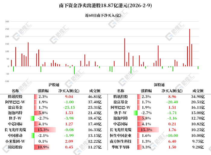 智通财经APP获悉,2月4日,腾讯控股(00700)、南方恒生科技(03033)、阿里巴巴-W(09988)南向 资金净流入金额位列市场前三,分别净流入22.40 亿、13.11 亿、11.65 亿 中芯国际(00981)、华虹半导体(01347)、昆仑能源(00135)南向资金净流出金额位列市场前三, 分别净流出-7.08 亿、-2.40 亿、-1.43 亿 | 股票名称 | 净流出比↓ | 净流出(元) | 收盘价 | | --- | --- | --- | --- | | 晶苑国际(02232) | -82.51% | -3274.86 万 | 7.350(+1.38%) | | 昆仑能源(00135) | -56.21% | -1.43 亿 | 8.110(+1.50%) | | 海螺创业(00586) | -55.95% | -4604.41 万 | 10.820(+1.50%) | | 保诚(02378) | -53.04% | -261.58 万 | 130.000(-0.31%) | | 国药控股(01099) | -52.34% | -1.10 亿 | 21.120(+0.67%) | | ...