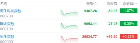 2月3日,受传闻影响,早盘科技股大幅走低拖累三大指数跳水,临近午盘回升午后维持震荡行情。 恒生指数最终收涨0.22%,盘中一度跌至1.3%,国企指数跌0.3%,恒生科技指数跌1.07%盘中曾大跌3.4%。 | 名称 | | 最新价 | 涨跌额 | 涨跌幅 ^ | | --- | --- | --- | --- | --- | | 恒生科技指数 | | 5467.26 | -59.05 | -1.07% | | 800700 | and of the may | | | | | 国企指数 | | 9053.11 | -27.08 | -0.30% | | | 1 millioner | | | | | 800100 | | | | | | 恒生指数 | | 26834.77 | +59.20 | +0.22% | | 800000 | | | | | 具体盘面上,大型科技股多数转跌后维持跌势,黄金股带领有色金属股反弹;行业景气度持续回暖,重型机械股持续拉升,航空股强势。手游股板块跌幅靠 前,AI应用概念股、锂电池股、内银股、中资券商股、汽车股部分低迷。 | 行业热力图 √ | 领涨板块 | | | | | | ...