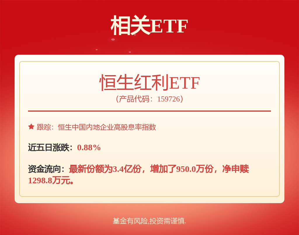 港股消费(159735)现任基金经理为李宜璇。李宜璇自2021年5月25日管理(或拟管理)该基金,任职 期内收益-16.29%。 来源:新浪基金∞工作室 数据显示,12月1日,港股消费(159735)遭净赎回83.79万元,位居当日跨境ETF净流出排名32/198。最新 规模7.75亿元,前一日规模7.71亿元,当日资金净流出额占前一日规模的比例为0.11%。 近5日,港股消费(159735)遭净赎回83.79万元,位居跨境ETF净流出排名第72/198。近10日,港股消费 (159735)遭净赎回83.79万元,位居跨境ETF净流出排名第61/198。近20日,港股消费(159735)获净申购 87.48万元,位居跨境ETF净流入排名第130/198。 港股消费(159735)成立于2021年5月25日,基金全称为银华中证港股通消费主题交易型开放式指数证 券投资基金,基金简称为港股消费。该基金管理费率每年0.50%,托管费率每年0.10%。港股消费 (159735)跟踪标的指数为港股通消费CNY(931455)。 规模方面,截止12月1日,港股消费(159735)最新份额为9.26亿份,最新规模为7.75亿 ...