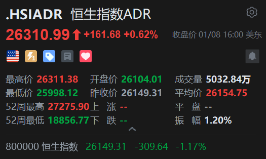 智通财经APP获悉,周四,美股三大指数涨跌不一。恒生指数ADR上涨,按比例计算,收报26310.99点,较香港收市升161.88或0.62%。 大型蓝筹股涨跌不一,汇丰控股收报125.439港元,较香港收市升0.92%;腾讯控股收报615.197港元,较香港收市跌0.13%。 | 序号 名称 | | 港股代码 | 最新价 | 涨跌额 | 涨跌幅 | ADR代码 | ADR换算价 | 较港股升跌 | 较港股升跌% | ADR | | --- | --- | --- | --- | --- | --- | --- | --- | --- | --- | --- | | 1 | 腾讯控股 | 9 00700 | 616.000 | -8.500 | -1.36% | TCEHY | 615.197 | -0.803 | -0.13% | 7 | | 2 | 阿里巴巴-W | 09988 | 142.600 | -3.300 | -2.26% | BABA | 150.458 | +7.858 | 5.51% | 15 | | 3 | 汇丰控股 | 00005 | 124.300 | -2.900 | -2.28% ...