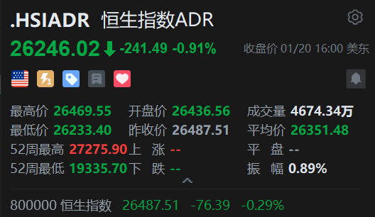 智通财经APP获悉,周二,美股三大指数集体收跌。恒生指数ADR下跌,按比例计算,收报26246.02点,较香港收市跌241.49点或0.91%。 | 序号 | 名称 | 港股代码 | 最新价 | 涨跌额 | 涨跌幅 | ADR代码 | ADR换算价 | 较港股升跌 | 较港股升跌% ADR | | | --- | --- | --- | --- | --- | --- | --- | --- | --- | --- | --- | | 1 | 腾讯控股 | 0 00700 | 601.000 | -9.000 | -1.48% | TCEHY | 593.183 | -7.817 | -1.30% | 7 | | 2 | 阿里巴巴-W | 09988 | 159.700 | -0.700 | -0.44% | BABA | 158.308 | -1.392 | -0.87% | 16 | | 3 | 汇丰控股 | 00005 | 128.400 | +1.400 | 1.10% | HSBC | 128.682 | +0.282 | 0.22% | 00 | | 4 | 建设银行 | 00939 | 7.76 ...