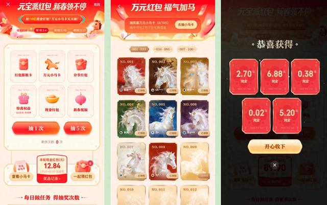 活动开启不久,已有超过10张价值万元的"小马卡"被用户抽中。据悉,用户将元宝App更新至2.55.0及 以上版本,即可通过首页入口进入活动主会场。整个活动将持续至2月17日,设有"主会场抽红包"与"祝 福语红包"两大板块,用户最高有机会获得万元现金红包。在主会场,用户每日可获5次抽奖机会,完成 指定任务还可额外增加40余次机会。奖品除现金红包外,还包括万元小马卡、红包膨胀卡、分享红包、 各类权益及新春祝福等。 在移动支付时代通过红包创造增长奇迹的腾讯,如今正试图以同样手法为其AI产品"元宝"打开市场入 口。 2月1日零时,腾讯"上元宝,分10亿"春节红包活动正式上线。 来源:北京日报客户端 大手笔发红包,对腾讯不是第一次。2015年,微信支付凭借与央视春晚合作的"摇一摇"红包,在短时间 内实现互动110亿次,红包收发总量突破10亿次,成功切入当时由支付宝主导的移动支付市场,自此春 节红包成为互联网行业的重要竞争场景。实际上,腾讯公司董事会主席兼首席执行官马化腾在内部会议 上表示,希望借此唤起11年前微信红包成功破局的市场效应。 值得注意的是,今年春节红包战况依然激烈。百度也于近期宣布投入5亿元开展春节红包活动 ...