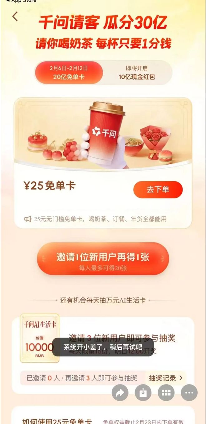 编辑|钉钉 记者|陈杨园 2月6日,阿里千问正式上线"春节30亿免单",发放奶茶免单卡。记者发现,继微信封杀自家腾讯元宝、 百度文心助手后,千问的红包分享链接也被微信屏蔽,页面显示网页存在诱导或误导下载/跳转的内 容,需要跳转第三方浏览器访问。同时,部分用户在千问APP点击分享活动至微信好友时,已自动改为 复制口令形式。 此外,千问上线奶茶免单活动后,部分用户打开活动页面,发现"千问请客"页面无法点击,页面信息显 示"系统开小差了,稍后再试吧"。有用户对记者反馈,除活动页面外,问答功能仍可正常使用。 ...