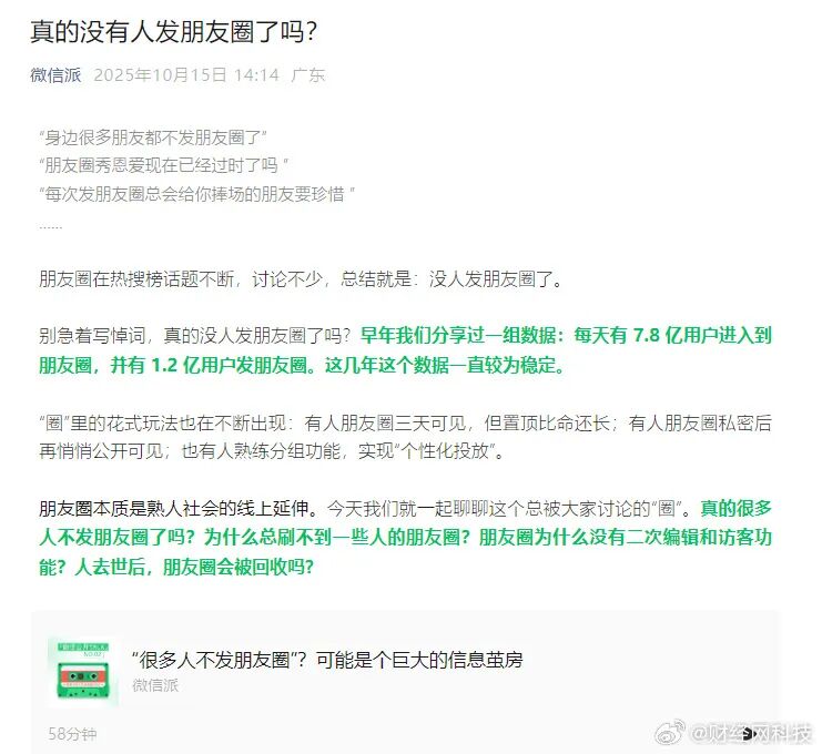 据媒体消息,10月15日,微信派发文称,朋友圈在热搜榜话题不断,讨论不少,总结就是:没人发朋友圈了。 对此,微信在文中表示,早年微信分享过一组数据:每天有 7.8 亿用户进入到朋友圈,并有 1.2 亿用户发朋友圈。这几年这个数据一直较为稳定。 此外,微信公关总监@粥姨姨 在播客中表示,微信朋友圈不会有访客功能,"微信在涉及产品逻辑的时候不希望给大家增加更大的社交压力"。 微信公关总监@粥姨姨还表示,朋友圈不太可能出二次编辑功能,"朋友圈是记录一个人的历史,一个人的人生是没有办法回去修改的,所以也不好让人 轻易去篡改自己的编年史"。 此前,腾讯方面曾多次辟谣相关话题。 5月30日,腾讯公关总监张军发文辟谣"微信如果推出朋友圈访客"和"如果微信推出已读功能"两个热门话题。 4月9日,据媒体消息,近日,多名网友讨论社交软件上"已读显示"及"访客记录"等功能。对此,腾讯高管作出回应。 有网友表示,反对微信开通这两项功能,该功能可能会暴露阅读状态,导致社交压力。 腾讯客服表示,目前微信暂无消息已读功能。 相关话题登热搜榜,引发大批网友继续讨论。 他表示,不明白为何总有人反反复复地创造"如果",前两天所谓朋友圈访客功能, ...