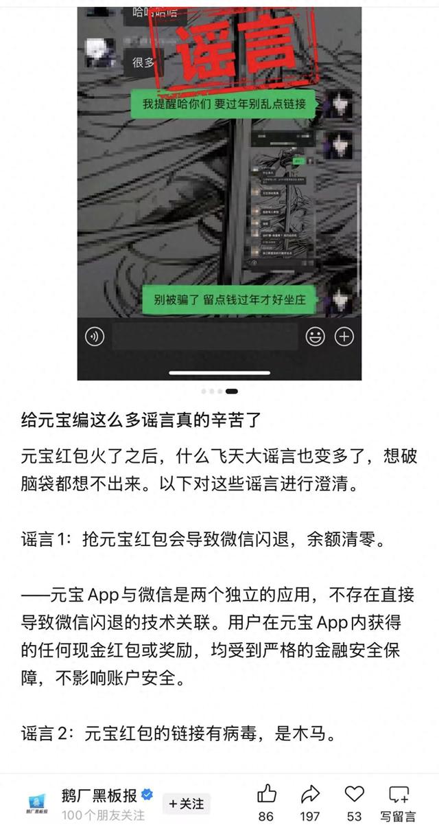 来源:环球网 【环球网科技综合报道】2月4日消息,就元宝App相关传言,腾讯官方在公众号"鹅厂黑板报"发文回应 对这些谣言进行澄清。 其中,针对"抢元宝红包会导致微信闪退,余额清零"话题,腾讯方面称,元宝App与微信是两个独立的 应用,不存在直接导致微信闪退的技术关联。用户在元宝App内获得的任何现金红包或奖励,均受到严 格的金融安全保障,不影响账户安全。 ...