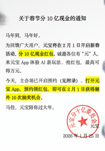 Core Insights - Tencent is launching a cash giveaway of 1 billion yuan during the Spring Festival, aiming to replicate the success of the WeChat red envelope feature [1][4] - The new feature, "Yuanbao Pai," will allow users to create or join groups where AI can participate in chats and perform tasks, indicating a shift towards integrating AI in social applications [4] Group 1 - Tencent's chairman, Ma Huateng, announced the 1 billion yuan cash activity during the annual meeting, highlighting the goal of reviving the popularity of WeChat red envelopes [1] - The cash giveaway will be available on the Yuanbao app starting February 1, with individual red envelopes potentially reaching up to 10,000 yuan [1] - Yuanbao has been recognized as one of the top three AI-native applications in China, suggesting its strong market position [4] Group 2 - The Yuanbao app is set to introduce a new feature called "Pai," which is currently in internal testing and will soon be publicly available [4] - This new feature aims to enhance user interaction by allowing AI to engage in conversations and manage group dynamics, marking a strategic move for Tencent in the AI and social sectors [4] - The development of "Yuanbao Pai" reflects Tencent's intention to innovate within the AI landscape, potentially leading to new opportunities in social engagement [4]