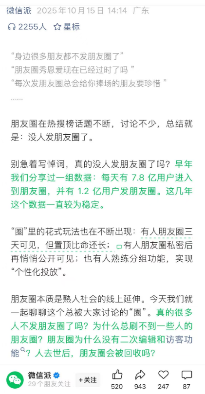 Core Insights - The topic "Is WeChat Moments cooling down?" has become a trending subject on social media as of October 16 [1] - A response article titled "Is no one really posting on Moments?" was published by the WeChat official account on October 15, addressing concerns about the usage of Moments [2] Group 1: User Engagement and Data - According to the WeChat public relations director, 780 million users access Moments daily, with 120 million users posting on it, indicating stable engagement over the years [4] - The director refuted claims that fewer people are posting on Moments, suggesting that such perceptions are subjective and akin to an "information cocoon" [4] Group 2: Product Features and Philosophy - The WeChat public relations director clarified that the Moments feed is sorted chronologically without an algorithm, emphasizing a straightforward approach to content visibility [4] - Regarding the absence of a visitor feature and secondary editing for Moments, the director stated that these decisions are made to avoid increasing social pressure on users [4] - The director also mentioned that Moments serves as a historical record of an individual's life, and thus, the introduction of a secondary editing feature is unlikely [4]
