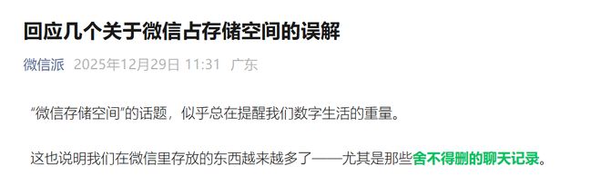 微信官方回应存储空间占用变多:聊天记录平均占七成