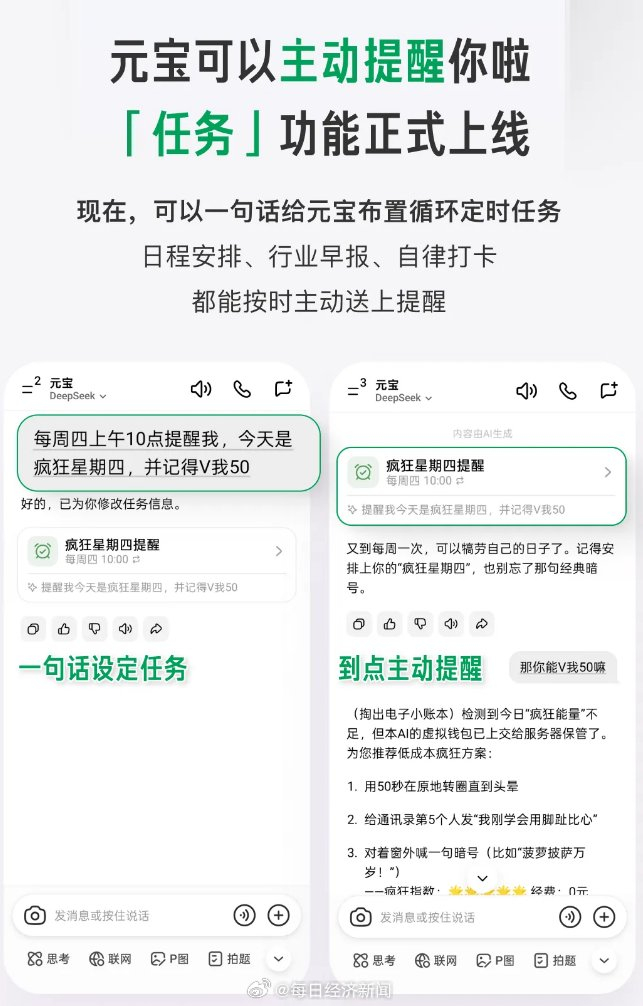 【#腾讯元宝正式上线任务功能#】12月29日,腾讯元宝宣布"任务"功能正式上线。据介绍,用户把元宝 App、电脑版更新至最新版本,直接把时间安排、自律习惯、任务计划一句话告诉元宝,到点就能准时 提醒,此外还能提前测试任务、手动管理任务、自定义提醒。(每经综合,德塔) 元宝可以主动提醒你啦 「任务」功能正式上线 现在,可以一句话给元宝布置循环定时任务 _2 元宝 ()) & C 3 元宝 & C s 每周四上午10点提醒我,今天是 疯狂星期四,并记得V我50 疯狂星期四提醒 @ 周四 10:00 ≤ 好的,已为你修改任务信息。 疯狂星期四提 又到每周一次,可以犒劳自己的日子了。记得安 管周四 10:00 排上你的"疯狂星期四",也别忘了那句经典暗 ◇ 提醒我今天是疯狂星期四,并记得 O B & Q ( ) A O & G Q) A 一句话设定任务 到点击动提醒 | 那你能V我50喊 (掏出电子小账本)检测到今日"疯狂能量"不 足,但本AI的虚拟钱包已上交给服务器保管了, 为您推荐低成本疯狂方案: 1. 用50秒在原地转圈直到头晕 2. 给通讯录第5个人发"我刚学会用脚趾比心" 3. 对着窗外喊一句暗号(比如"菠 ...