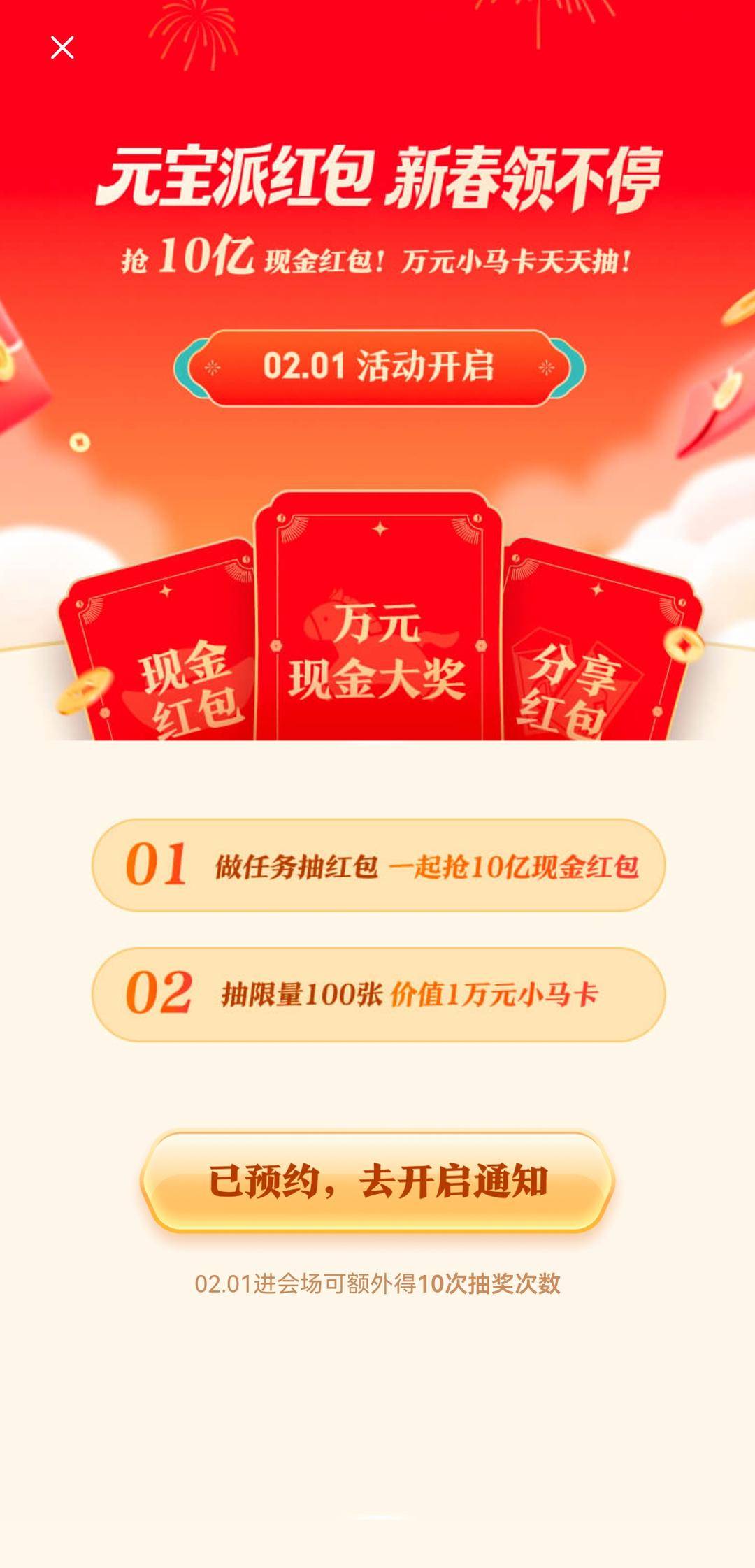 1 月 26 日消息,今天小雷在微博热搜上看到,大厂们已经逐步预热新年红包活动了。 正好今天是腾讯开年会的日子。马化腾在会上表示,希望 AI 应用元宝的「春节分 10 亿元现金」活动,可以重现当年微信红包的盛况。 图源:微博截图 大家都知道小雷最喜欢薅羊毛,先来看看元宝这个现金活动到底是怎么个事儿。 日前,腾讯元宝宣布将在 2 月 1 日正式开启分 10 亿元现金活动,更新到元宝APP 2.55.0 版本就能预约,预约成功还能多拿 10 次抽奖机会。小雷顺手更新试 了下,入口还挺醒目的。 图源:元宝APP 至于马化腾想要重现的「微信红包盛况」,2015年微信首次和央视春晚合作,推出了"摇一摇"抢红包功能,把红包从「线下发」搬到「线上抢」,掀起了一 波全民狂欢。该说不说,这合作是真双赢。 图源:央视网 你想啊,微信的用户基数非常大,通过和 CCTV 春晚合作,能进一步扩大影响力。而春晚这边呢,可以充分利用微信的大基数,吸引更多的人看春晚。用 红包留人,收视率不就上去了嘛。 不过可能有些朋友想问,小雷啊,你刚都说微信用户基数很大,为什么还需要跟央视合作呢?要知道,现在不是每个人都有看春晚的习惯,但可能每个人都 在 ...