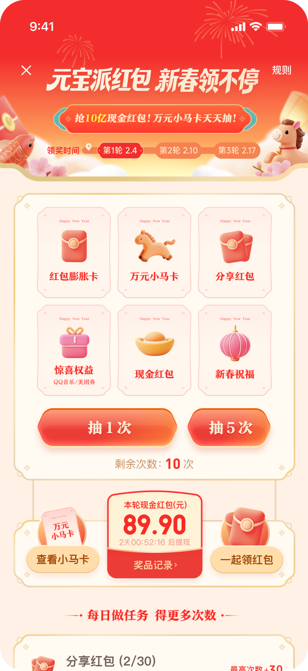 2月1日0时,腾讯"上元宝,分10亿"活动正式开启,一上线便引发了全网狂欢:一夜之间超过10张万元小马卡被"翻牌","元宝出钱、好友拆红包"成为新 春潮流,网友纷纷晒出自己的"首晚战绩""野生攻略"...... 用户将元宝APP更新到2.55.0版本以上,进入首页点击底部"抢10亿",即可进入新春活动主会场。活动从2月1日持续到2月17日,包含"主会场抽红 包"和"祝福语红包"两大核心玩法。 越抽越有,万元"小马卡"等你翻牌 在主会场,用户每天都可获得5次抽奖机会,通过做任务,每天还可以额外获得40+次抽奖机会,有机会抽到现金红包、万元现金小马卡、红包膨胀卡、 分享红包、惊喜权益、新春祝福等不同类型红包。 通过不断抽红包,用户每一轮的现金红包金额将逐步累加,在提现日,可以直接将"该轮累计现金红包金额x该轮膨胀卡倍数"的现金总额存入微信钱包, 据了解,膨胀卡倍数最高能达到5倍。 万元小马卡限量100张,每张都拥有专属的设计,百只小马形态各异,幸运用户抽中之后可以在2月17日当天完成提现。 分享红包支持转发给微信、QQ好友和社群,让元宝出钱、好友拆红包,分享红包被领取后,还能获得额外抽奖次数和现金红包。 UNTE ...