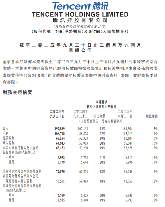 【导读】 受人工智能推动,腾讯季度营收增长15% 中国基金报记者 泰勒 大家好,11月13日港股收盘后,腾讯发布了第三季度财务报表,一起看看有何亮点。 一、第三季度营收、利润 最新财报显示, 第三季度营收达到1928.7亿元人民币,超出市场预估的1888亿元;净利润达631.3亿元,大幅超出预估的558.8亿元,环 比增幅达13%,同比增幅为19%。 | | | | FAT = / ] H / J T = | | | | --- | --- | --- | --- | --- | --- | | | 二零二五年 | 二零二四年 | | 二零二五年 | | | | 九月三十日 | 九月三十日 同比變動 | | 六月三十日 | 環比變動 | | | | | (人民幣百萬元,另有指明者除外) | | | | 人 | 192.869 | 167.193 | 15% | 184.504 | 5% | | 利 | 108,798 | 88,828 | 22% | 105.013 | 4% | | 管盈利 | 63.554 | 53.333 | 19% | 60.104 | 6% | | 内閣利 | 64.943 | 53 ...