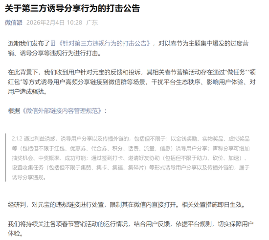 对此,2月4日当天,微信安全中心解释称,1月29日,微信发布了《针对第三方违规行为的打击公告》,对以春节为主题集中爆发的过度营销、诱导分享等 违规行为进行打击。在此背景下,微信收到用户针对元宝的反馈和投诉,其相关春节营销活动存在通过"做任务""领红包"等方式诱导用户高频分享链接到微 信群等场景,干扰平台生态秩序、影响用户体验、对用户造成骚扰。 临近春节,各大公司AI助手的运营团队发起了"红包大战",其中腾讯元宝以链接跳转形式在各大微信群内传播。不过,2月4日,观察者网发现,微信群内的 元宝链接遭到了微信方面屏蔽,引发不少网友疑惑"自家产品为何会拦截自家?" 另一方面,腾讯元宝在其官方微博上也进行了回应,称正在紧急优化调整分享机制,我们将尽快上线,确保用户抢红包体验。 本文系观察者网独家稿件,未经授权,不得转载。 微信安全中心发布的"元宝违规案例" 微信表示,经研判,对元宝的违规链接进行处置,限制其在微信内直接打开。相关处置措施即日生效。未来将持续关注各类春节营销活动的运行情况,结合 用户反馈,依据平台规则,切实保障用户体验。 ...