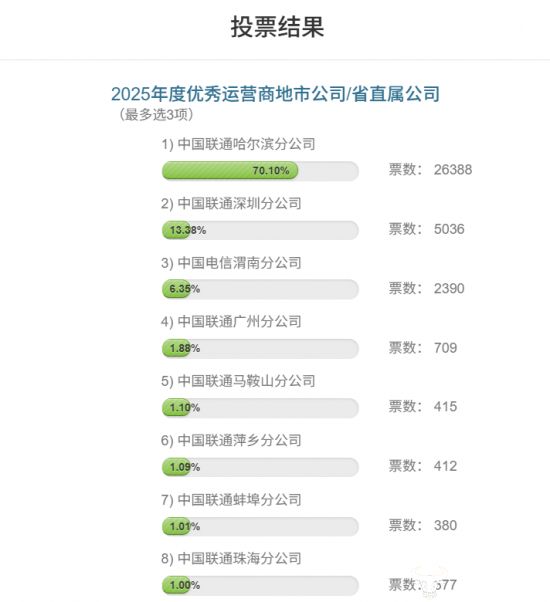 2025年度优秀运营商地市公司/省直属公司评选:哈尔滨联通 深圳联通 渭南电信暂领先