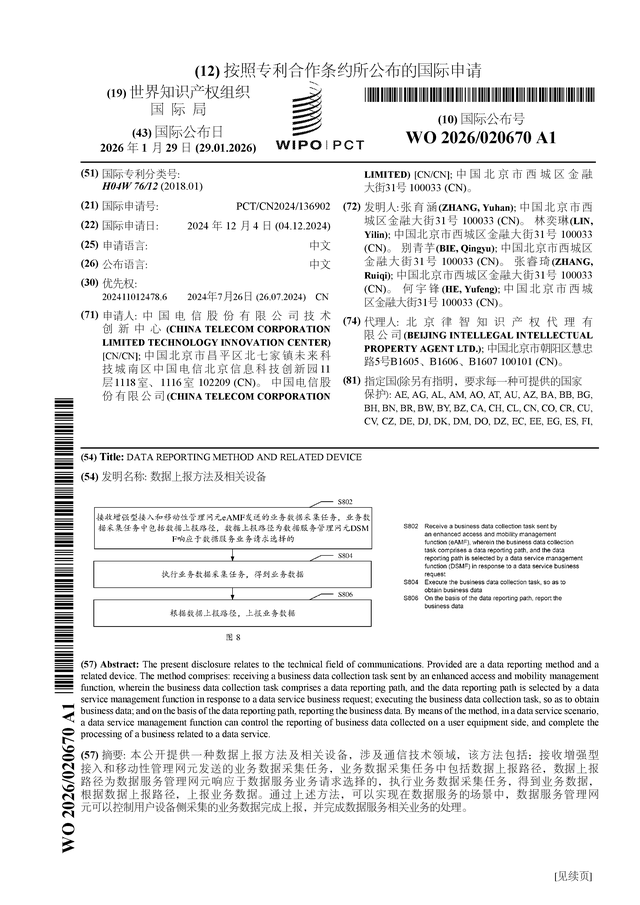 中国电信公布国际专利申请:“数据上报方法及相关设备”