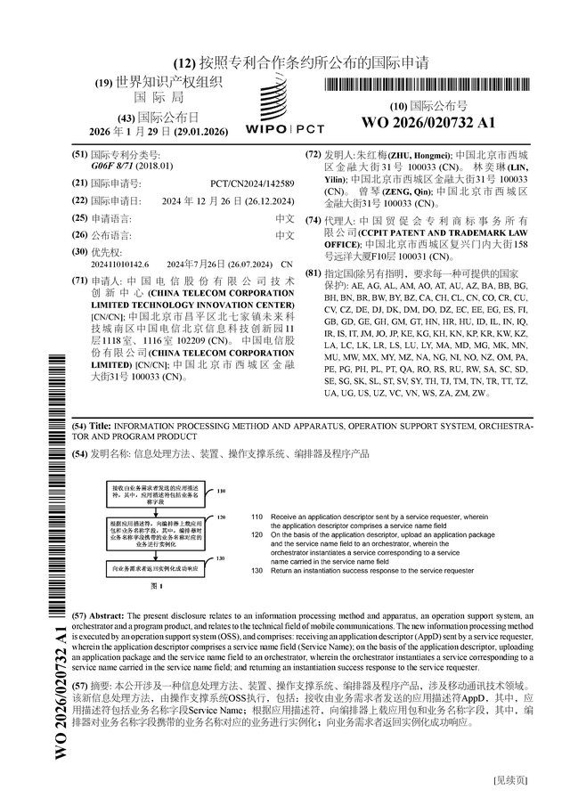 中国电信公布国际专利申请:“信息处理方法、装置、操作支撑系统、编排器及程序产品”