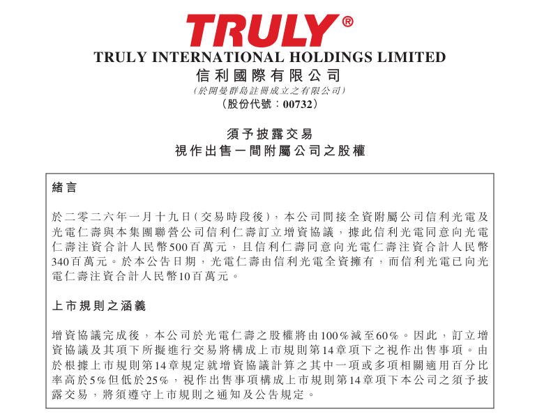 香 港 交 易 及 結 算 所 有 限 公 司 及 香 港 聯 合 交 易 所 有 限 公 司 對 本 公 告 的 內 容 概 不 負 責,對其準確性或完整性亦不發表任何聲明,並明確表示,概不對因本公告全部 或任何部份內容而產生或因倚賴該等內容而引致的任何損失承擔任何責任。 TRULY INTERNATIONAL HOLDINGS LIMITED 信 利 國 際 有 限 公 司 (於開曼群島註冊成立之有限公司) (股份代號:00732) 須予披露交易 視作出售一間附屬公司之股權 緒言 於二零二六年一月十九日( 交易時段後 ),本公司間接全資附屬公司信利光電及 光電仁壽與本集團聯營公司信利仁壽訂立增資協議,據此信利光電同意向光電 仁 壽 注 資 合 計 人 民 幣 500 百 萬 元 , 且 信 利 仁 壽 同 意 向 光 電 仁 壽 注 資 合 計 人 民 幣 340百萬元。於本公告日期,光電仁壽由信利光電全資擁有,而信利光電已向光 電仁壽注資合計人民幣10百萬元。 上市規則之涵義 增資協議完成後,本公司於光電仁壽之股權將由100 %減至60 %。因此,訂立增 資協議及其項下所擬進行交易將構成上市規則第14章 ...